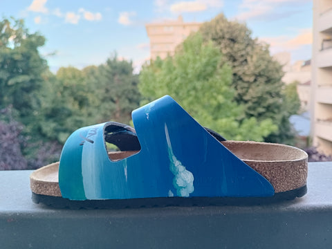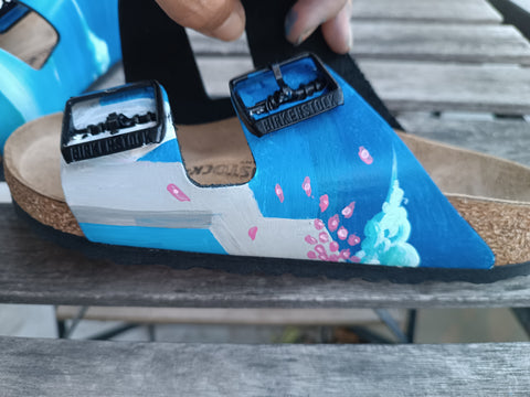 Toutes les baskets sont peintes à la main, avec des Posca et de l'Angelus. Ensuite, nous appliquons un vernis pour imperméabiliser le dessin et améliorer sa longévité.